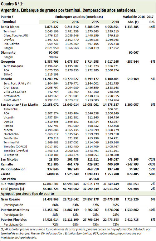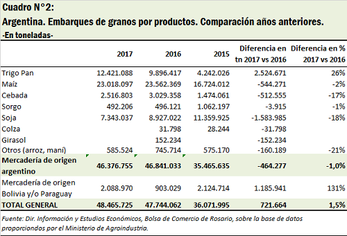 Según el trabajo elaborado por los economistas Julio Calzada y Emilce Terré, el año pasado se embarcaron en los puertos argentinos un total de 12,4 millones de toneladas, lo que significa un 26 por ciento más que las 9,9 millones de 2016.