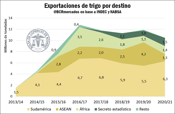 Cruzando el océano, el sudeste asiático encuentra a los principales clientes del trigo argentino en el ASEAN (Asociación de Naciones del Sudeste Asiático). Este bloque comercial incluye importantes compradores de trigo, como Indonesia, Bangladesh, Vietnam y Tailandia. El ASEAN se llevó más de 1,3 Mt en la campaña 2020/21, lo que representa una importante baja respecto a los 4,2 Mt de la campaña 2019/20. La exitosísima cosecha 2020/21 de Australia llevó la producción de trigo de 14 a 33 Mt en apenas un año comercial. Con una campaña 2021/22 estimada en torno a las 31,5 Mt, resultará complejo incrementar con fuerza las exportaciones de trigo hacia los destinos del Sudeste Asiático, ya que la cercanía logística de este bloque con Australia hace mucho más competitivo al trigo australiano.