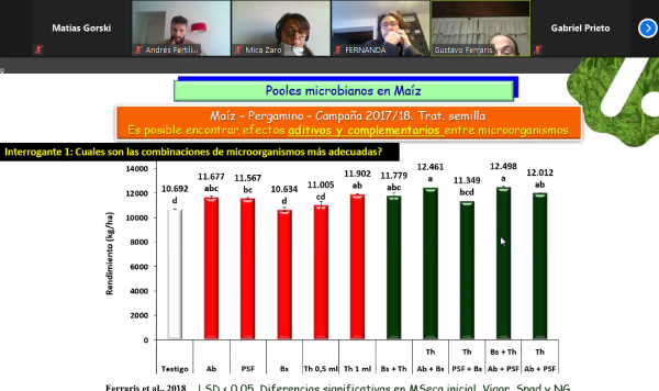 Asimismo, Ferraris mostró resultados de evaluaciones con distintos microorganismos y en combinación y afirmó el efecto aditivo que tienen estos productos a la fertilización tradicional, con la certeza de pensarlos como complementos y no como sustitutos.