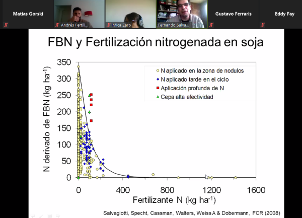 También el investigador señaló el efecto antagónico entre la fertilización nitrogenada y la respuesta de la FBN y evidenció el impacto de la incorporación de distintas fuentes y fertilizantes sobre la nodulación y posterior efecto de la FBN.