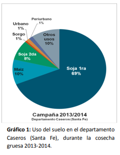 El panorama planteado de gran simplificación productiva-ambiental podemos analizarla más minuciosamente en el corazón del sur de Santa Fe, como es el departamento Caseros. Los cultivos predominantes durante la temporada estival son soja y maíz, muy por detrás vienen otras especies cultivadas y usos del suelo. La proporción exacta de estos podemos observarla en el gráfico 1. Los datos de superficie sembrada se basan en información publicada por la dirección de Estimaciones Agrícolas del Ministerio de Agricultura, Ganadería y Pesca de la Nación (https://www.magyp.gob.ar/sitio/areas/estimacio nes/). Se observa que al sumar la superficie de soja y maíz, los mismos utilizan el 87% del suelo del departamento Caseros en la época estival. Los cálculos del área urbana provienen de http://rafaela.inta.gov.ar/mapas/capacidad_productiva/index.htm. Estos últimos valores, probablemente estén ligeramente subestimados, por lo dinámicas que son estas zonas. El área periurbana, fue determinada como el espacio comprendido entre la planta urbana y 500 metros, de las localidades del departamento Caseros. En estas zonas conviven usos diversos y es donde se están produciendo cambios importantes. Si bien, esta última área puede estar cubierta con los tres cultivos mayoritarios de la región, la clara tendencia es a diversificarse. Ya sea por estrategias vinculadas al manejo de los cultivos, como por el establecimiento de producciones de alimentos para el consumo local o regional.