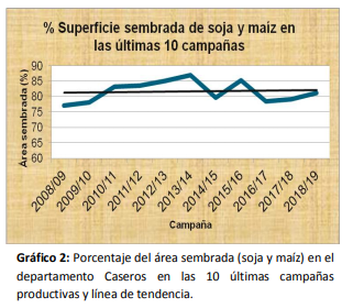 El predominio de escasos cultivos en el Departamento, no ha cambiado en las últimas 10 temporadas, como vemos en el gráfico 2. La línea negra marca la tendencia para los años analizados y muestra un crecimiento, casi imperceptible, de la superficie ocupada de los dos cultivos mayoritarios. Por ello, podríamos asumir que se ha mantenido sin cambios significativos.