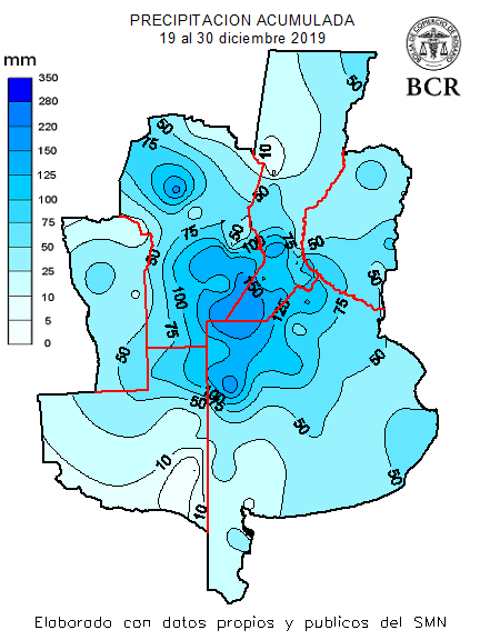 Desde el 19 hasta el 30 de diciembre, las lluvias acumuladas en la franja central se acercan o incluso ya superan las medias mensuales de diciembre que están en el orden de los 80 a 150 mm. En toda la provincia de Córdoba hubo lluvias superiores a los 50 mm, superando los 100 mm en el 30% de su territorio, justo en la zona más deficitaria cómo se destacaba hace un mes. Pero también hubo localidades afectadas negativamente dónde en pocas horas la gran cantidad de milímetros provocó inundaciones cómo en Jesús María. En el sur de Santa Fe gran parte del área acumuló de 100 a más de 150 mm. El norte bonaerense de este a oeste tiene un gradiente creciente que arranca en los 50 mm y termina con más 100 mm. Una porción muy acotada del norte de la Pampa recibió más de 50 mm. Pero del centro de Buenos Aires hacia el sur es otro cantar, las lluvias estuvieron por debajo de los 25 mm y se profundiza la necesidad de agua.
