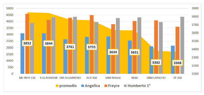 La variedad de mejor rendimiento promedio en los tres sitios evaluados (Freyre, Humberto Primo y Angélica) fue MS INTA 116 con 3852 kg/ha, mientras que la de menor rendimiento promedio fue SY 330 con 3368 kg/ha (ver gráfico 1).