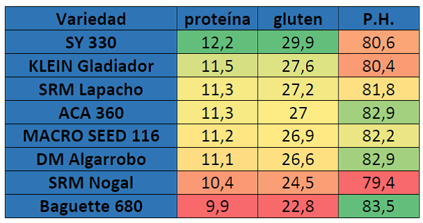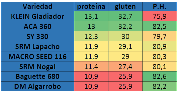 Se analizó en la Cámara Arbitral de la Bolsa de Comercio de Buenos Aires la calidad comercial por variedad en cada sitio de ensayo. Se observó que proteína y gluten registraron tendencias similares en variedades y sitios, no así en peso hectolítrico, donde no se observó un patrón claro de comportamiento por variedad. Se destacó SY 330 en los tres sitios y Gladiador en Freyre y Humberto Primo (ver cuadros 1, 2 y 3).