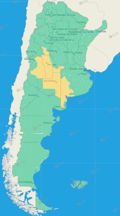 Buenos Aires: Norte de Bahía Blanca – Oeste de Patagones – Oeste de Villarino – Puan – Zona baja de Coronel Pringles – Zona baja de Coronel Suárez – Zona baja de Saavedra – Zona baja de Tornquist – Costa de Bahía Blanca – Costa de Coronel Dorrego – Costa de Coronel de Marina Leonardo Rosales – Costa de Villarino – Monte Hermoso – Norte de Bahía Blanca – Oeste de Patagones – Oeste de Villarino – Puan – Zona baja de Coronel Pringles – Zona baja de Coronel Suárez – Zona baja de Saavedra – Zona baja de Tornquist – Adolfo Alsina – Daireaux – Guaminí – Pellegrini – Salliqueló – Trenque Lauquen – Tres Lomas