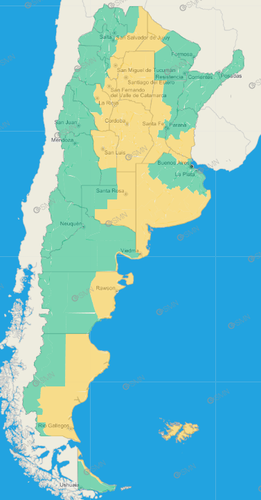 Buenos Aires: Este de General Lavalle – La Costa – Pinamar – Sudeste de General Juan Madariaga – Villa Gesell – Costa de General Pueyrredón – Costa de Mar Chiquita – General Alvarado – Ayacucho – Balcarce – General Guido – Maipú – Noroeste de General Juan Madariaga – Noroeste de Mar Chiquita – Oeste de General Pueyrredón – Costa de Lobería – Costa de Necochea – Costa de San Cayetano – Costa de Tres Arroyos – Adolfo Gonzales Chaves – Centro de Lobería – Norte de Coronel Dorrego – Norte de Necochea – Norte de San Cayetano – Norte de Tres Arroyos – Norte de Bahía Blanca – Oeste de Patagones – Oeste de Villarino – Puan – Zona baja de Coronel Pringles – Zona baja de Coronel Suárez – Zona baja de Saavedra – Zona baja de Tornquist – General La Madrid – Laprida – Olavarría – Adolfo Alsina – Daireaux – Guaminí – Pellegrini – Salliqueló – Trenque Lauquen – Tres Lomas – Costa de Patagones – Florentino Ameghino – General Villegas – Rivadavia – Bolívar – Carlos Casares – Carlos Tejedor – Hipólito Yrigoyen – Pehuajó – Costa de Adolfo Alsina