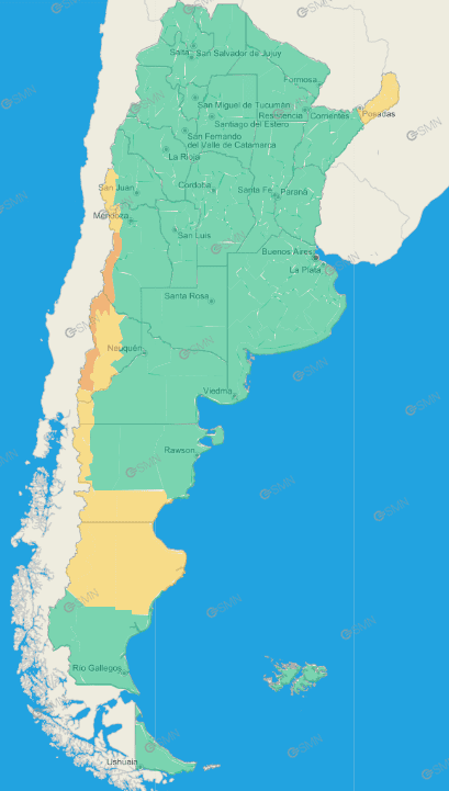 En la Patagonia, el área será afectada por lluvias persistentes y localmente fuertes. Se esperan valores de precipitación acumulada entre 20 y 30 mm, pudiendo ser superados en forma localizada. No se descarta la ocurrencia de nevadas en las zonas más elevadas de la cordillera.