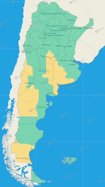Buenos Aires: Costa de Patagones – Costa de Bahía Blanca – Costa de Coronel Dorrego – Costa de Coronel de Marina Leonardo Rosales – Costa de Villarino – Monte Hermoso – Norte de Bahía Blanca – Oeste de Patagones – Oeste de Villarino – Puan – Zona baja de Coronel Pringles – Zona baja de Coronel Suárez – Zona baja de Saavedra – Zona baja de Tornquist – Costa de Lobería – Costa de Necochea – Costa de San Cayetano – Costa de Tres Arroyos – Adolfo Gonzales Chaves – Centro de Lobería – Norte de Coronel Dorrego – Norte de Necochea – Norte de San Cayetano – Norte de Tres Arroyos – General La Madrid – Laprida – Olavarría – Adolfo Alsina – Daireaux – Guaminí – Pellegrini – Salliqueló – Trenque Lauquen – Tres Lomas – Bolívar – Carlos Casares – Carlos Tejedor – Hipólito Yrigoyen – Pehuajó – Florentino Ameghino – General Villegas – Rivadavia