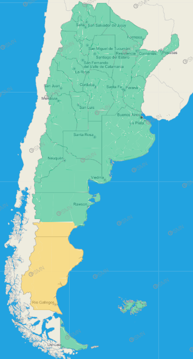 Santa Cruz: Cordillera de Lago Buenos Aires – Cordillera de Río Chico – Meseta de Lago Buenos Aires – Meseta de Río Chico – Meseta de Deseado – Meseta de Magallanes – Costa de Deseado – Costa de Magallanes – Meseta de Corpen Aike – Meseta de Güer Aike – Meseta de Lago Argentino – Cordillera de Güer Aike – Cordillera de Lago Argentino – Costa de Güer Aike