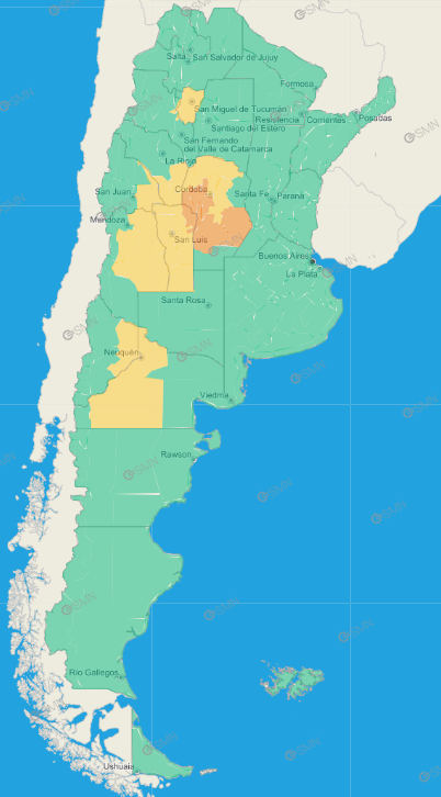Córdoba: General San Martín – Marcos Juárez – Unión – Juárez Celman – Zona baja de Río Cuarto – Zona serrana de Calamuchita – Zona serrana de Río Cuarto – Punilla – Zona serrana de Colón – Zona serrana de Ischilín – Zona serrana de Santa María – Zona serrana de Totoral – Oeste de Pocho – Oeste de San Alberto – Oeste de San Javier – Río Primero – Río Segundo – Tercero Arriba – Ischilín – Río Seco – Sobremonte – Tulumba – Zona baja de Cruz del Eje – Zona baja de Minas