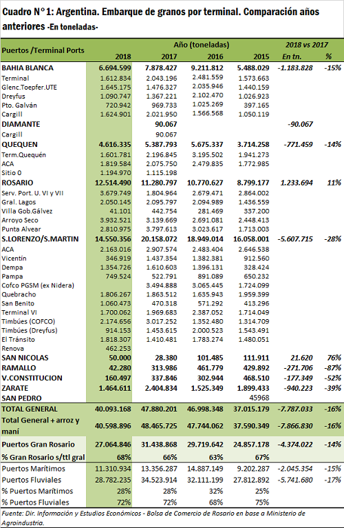 En una campaña caracterizada por las elevadas temperaturas y la escasez de lluvia, que tuvieron un fuerte impacto negativo sobre la producción nacional, en el año 2018 los despachos de granos al exterior desde todas las terminales portuarias argentinas tuvieron un importante descenso interanual del 16%, totalizando 40.598.896 toneladas.