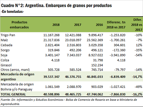 Pese a esto, incluso en un año de sequía, los embarques de 2018 todavía fueron un 8% superior a los del año 2015, cuando habían totalizado 37,5 Mt. Se computan en este indicador la suma de los despachos de los siguientes granos: trigo, maíz, soja, sorgo, cebada, colza, girasol, arroz, maní y otros, en base a información oficial provista por la Secretaría de Agroindustria.