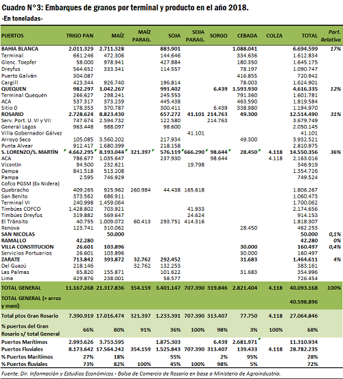 En 2018, los embarques de granos desde Argentina tuvieron una merma del 16% en relación al año anterior, totalizando 40,6 MT. Pese a esto, creció la participación de las terminales portuarias del Gran Rosario en los embarques de granos de Argentina, que llegó al 68%. Más de la mitad de los granos despachados por nuestro país fueron maíz. Las tres terminales portuarias que más despacharon granos en Argentina pertenecen a la “Zona Sur del Gran Rosario”. Estas fueron ADM Agro Arroyo Seco; Servicios Portuarios Unidades VI y VII; y Cargill Punta Alvear.