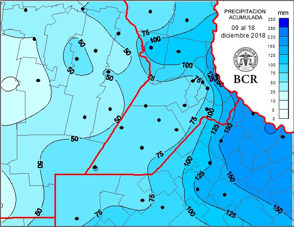 Del 9 al 18 de diciembre, en Entre Ríos hay marcas por encima de los 200 mm cómo enGualeguaychú con 288 mm o en Federal o Concepción del Uruguay con 240 mm. En Buenos Aires, San Pedro alcanzó los 243 mm. Le siguen Ramallo y Baradero con marcas de más de 170 mm, Pergamino con 155 mm y Chacabuco con 140 mm. Hay otra zona que se destaca en el NO bonaerense, un poco más acotada, con lluvias que van de los 100 a 130 mm.