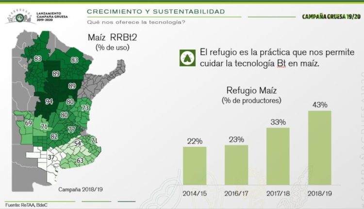 En la campaña 2018/19 la cantidad de empresarios agrícolas argentinos que realizaron refugios al sembrar maíz Bt (resistente a insectos) fue del 43% del total nacional, según datos de un relevamiento realizado por el Área de Investigación y Prospectiva Tecnológica de la Bolsa de Cereales de Buenos Aires.