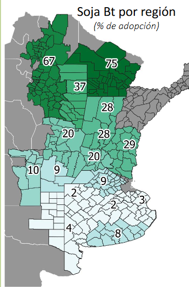 En cuanto a la soja Bt, en la campaña 2018/19 consolidó su nivel de adopción en las regiones de NOA y Chaco, mientras que en el norte de Santa Fe y Entre Ríos registró una penetración del 28% y 29% respectivamente. Sin embargo, se mantiene el uso marginal de esa tecnología en el sur de la zona pampeana.
