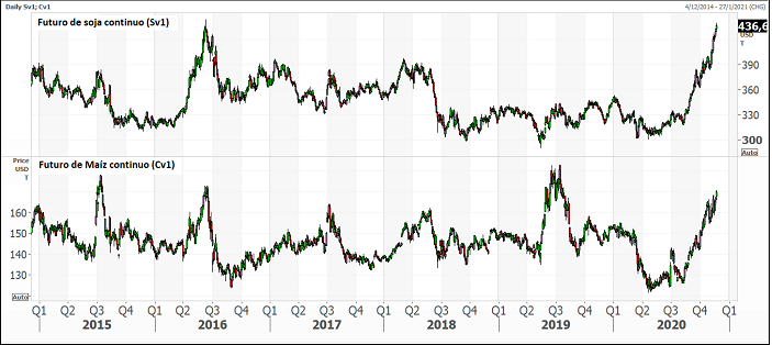 Los precios de referencia de la soja y el maíz en el mercado externo continúan firmes en su racha alcista. Tanto elementos propios del mercado, como es el déficit hídrico en algunos de los principales abastecedores mundiales de soja y maíz; como factores globales relacionados al atractivo de las inversiones en commodities en un contexto de debilitamiento del dólar en el mundo, foguean la suba.