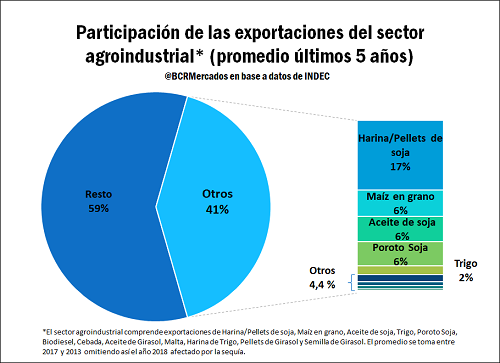 En los últimos 5 años, las exportaciones del complejo agroexportador que comprende soja y subproductos (incluyendo biodiesel), maíz en grano, trigo y harina, girasol, cebada y sus subproductos, presentaron alrededor del 41 % de las exportaciones anuales de Argentina, oscilando entre el 38 y 46 % del total en dicho período. El principal producto de exportación en dicho período ha sido la harina de soja que representa el 17 % de las exportaciones totales. En dicho análisis no se toma en cuenta la participación del año 2018 por presentarse una campaña agrícola de fuerte caída en la producción.