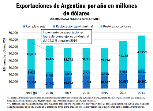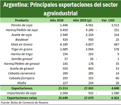 Las exportaciones del complejo agroexportador que comprende soja, maíz en grano, trigo, girasol, cebada, harinas, aceites y otros subproductos alcanzarían un total de 28.000 M USD en el año 2019. En comparación al año 2018 equivale a un aumento de 4.800 millones de dólares. Si se consideran las menores importaciones de soja para 2019 el saldo neto sería un aporte adicional del sector de 6.400 millones de dólares.