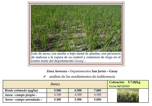 El proceso de siembra en el área arrocera retomó lentamente su accionar y a media que las condiciones de piso lo permitieron se incrementó el ritmo. El mismo presentó un progreso del orden del 95 % sobre lo proyectado, representando 30.400 ha. Con un retraso de 4 % en comparación a la campaña del año anterior. La intención de siembra sería similar a la superficie sembrada en 2017/2018, alcanzando las 32.000 ha. En cuanto al área que estuvo muchos días inundada como consecuencia de los eventos climáticos registrados, se observó una fuerte caída del stand de plantas, lejos del óptimo que sería de 250 plantas por m2. Otros indicadores fueron la muerte por anoxia y los intensos ataques de patos, especialmente en arroces de 3 – 4 hojas (etapa de transición). Por otro lado, también se advirtió en la mayoría de los lotes, grandes manchones de amarillamiento del cultivo, producto de las pérdidas de nitrógeno nativo por lixiviación, donde no se había aplicado urea y no estaban bajo riego. En general, el panorama aparece desmejorado con respecto a la situación inicial, antes de las grandes lluvias. Comenzaron a detectarse algunos focos de enfermedades secundarias en hojas (helmintosporiun y cercospora). Los cultivares se encontraron en los siguientes estados fenológicos: 3 – 4 hojas, macollaje, macollaje avanzado y principio de diferenciación. El valor comercial del grano de arroz con cáscara, tuvo una leve recuperación quedando en $ 7,00 /kg.