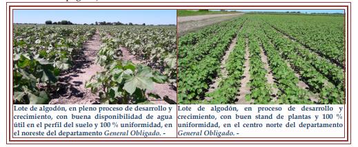La fecha de siembra del cultivo terminó el 15 de noviembre para el área este algodonera y para el oeste terminaría el 30 de noviembre por disposición del SENASA. De acuerdo a las condiciones de piso del suelo el proceso de siembra fue avanzando y en algunos lotes que se vieron afectados por el exceso hídrico y anegamiento de los mismos. En algunos casos se resembraron lotes por su