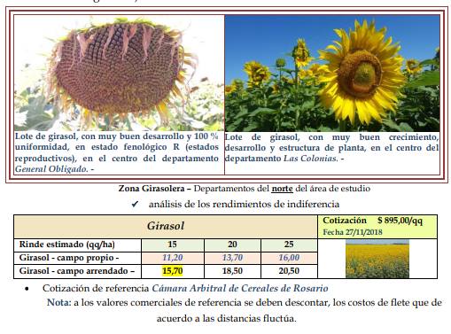 Continuó su crecimiento y desarrollo normal, con muy buena disponibilidad de agua útil en los suelos, tras las sucesivas precipitaciones registradas en toda el área, generando muy buenas condiciones en beneficio de los cultivares. El aspecto sanitario del cultivo, en general, se presentó muy bien, sin ataques de plagas, ni enfermedades hasta el momento. Se observaron los siguientes estados fenológicos: V “estados vegetativos”, V9 (9º par de hojas verdaderas), R “estados reproductivos” R2 (distancia de menos de 2 cm entre la inserción del botón floral y la última hoja), R3 (distancia de más de 2 cm entre la inserción del botón floral y la última hoja), R5 “antesis” R5 – 1 (inicio antesis) R5 – 5 (mitad de floración 50 %, el % depende del área del capítulo cubierto por flores, cantidad de círculos) y lotes más avanzados en R6 (fin de floración, caída de flores liguladas).