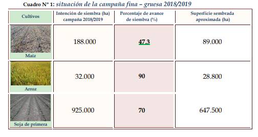 El proceso de siembra en el área arrocera no presentó actividad por falta de piso, con lo cual hasta la fecha continuó manifestando un progreso del orden del 90 % sobre lo proyectado, representando 28.800 ha. Con un retraso de 7 % en comparación a la campaña del año anterior. La intención de siembra sería similar a la superficie sembrada en 2017/2018, alcanzando las 32.000 ha. En una superficie aproximada de 1.000 ha se encontraron cultivos complicados por su permanencia bajo el agua durante diez días. Las áreas o sectores que se desagotaron mostraron un bajo stand de plantas y ante la fecha del año, serían imposibles las tareas de resiembra, por lo cual dicha superficie quedaría afectada, ya que en los próximos siete días culminaría la fecha