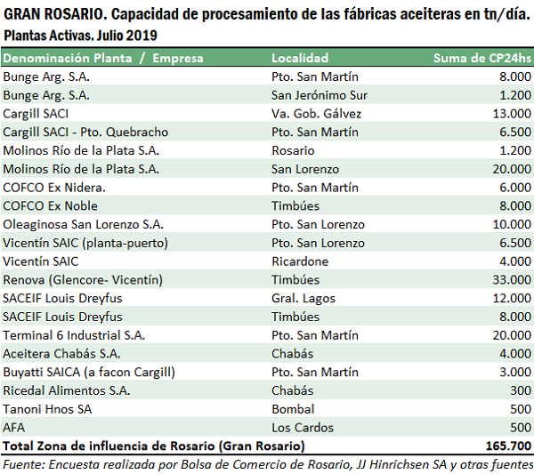 Cuando se considera la participación de cada empresa sobre la capacidad de crushing total de la zona se aprecian las importantes economías de escala que existen en el sector. Considerando la participación de cada grupo empresario, destaca en capacidad de procesamiento Vicentín, ya que cuenta con plantas con capacidad para industrializar 37.000 toneladas de oleaginosas diariamente (se le asigna a la empresa el 50% de la capacidad de la planta Renova S.A., cuya propiedad comparte con el Grupo Glencore), un 22% de participación sobre la capacidad de crushing total del área. A este le siguen la compañía Molinos Agro, que tiene capacidad de procesar unas 21.000 toneladas diarias, la empresa Louis Dreyfus que entre sus plantas de General Lagos y Timbúes cuenta con una capacidad de molienda de 20.000 toneladas diarias; y la empresa Cargill que es propietaria de dos plantas en el Gran Rosario y totaliza una industrialización potencial de 19.500 toneladas diarias. La empresa Bunge cuenta con tres plantas que le permiten contar con una capacidad teórica de molienda de 19.200 toneladas al día, en tanto que Glencore por su participación en Renova, tendría una capacidad de molienda en torno a las 16.500 toneladas diarias. Por último, tomando en cuenta solo las compañías más grandes, vienen las empresas COFCO International y Aceitera General Deheza, ambas con una capacidad de industrializar 10.000 toneladas diarias.