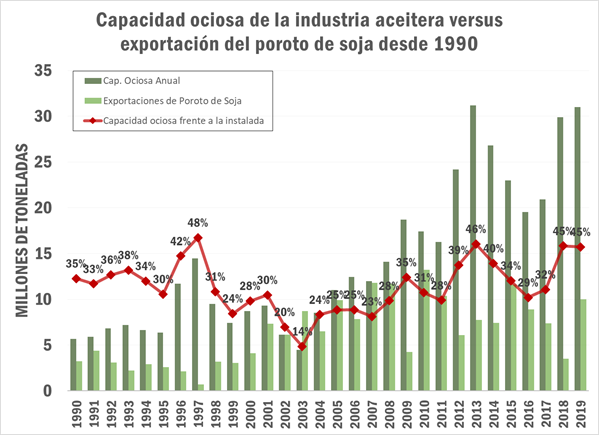 En el gráfico, vemos como la capacidad ociosa de la industria sufre un rápido ascenso en nuestro país entre el año 2017 y 2018, hasta alcanzar cerca del 45%. Esto último puede ser explicado por la mala campaña en cuanto a volumen producido, pero vemos que la capacidad ociosa se mantendría en altos niveles en 2019. La capacidad ociosa para el año 2019 se situaría en 41%, según estimaciones propias para el año que corre, aún a pesar de la gran cosecha en términos relativos.