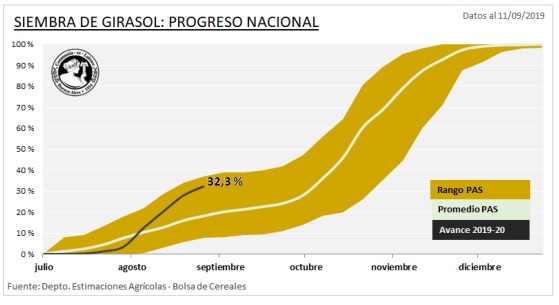 La siembra registró un progreso de 4,3 puntos porcentuales en la última semana y alcanzó a cubrir el 32,3 % del área estimada en 1,65 MHa para esta campaña. Respecto al año anterior aún se mantiene una demora de -4,8 puntos porcentuales. No obstante, la ocurrencia de precipitaciones en gran parte del área agrícola comienza a recargar el perfil de cara al inicio de las labores de siembra previstas para el mes de octubre en el resto de las zonas PAS, con lo cual se retomaría el ritmo habitual de siembra.