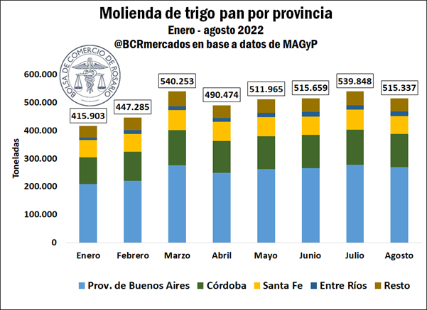 Si se analiza la molienda por provincias, no se observan grandes sobresaltos y se mantiene el protagonismo de Buenos Aires, Córdoba y Santa Fe representando el 51%, 23% y 13% del total nacional. En este sentido, estas tres jurisdicciones representan nada menos que el 87% de la industria molinera de nuestro país según datos de la Secretaría de Agricultura, Ganadería y Pesca (SAGyP).