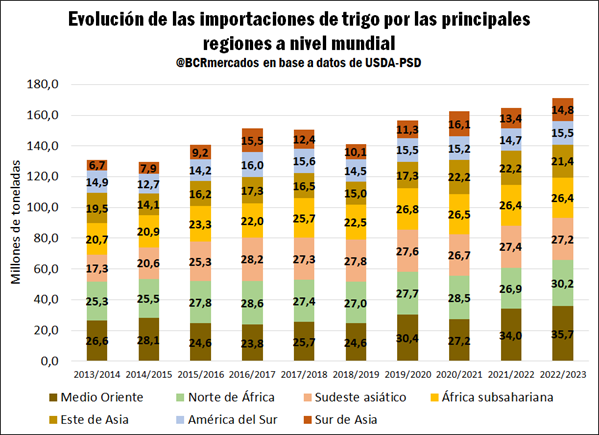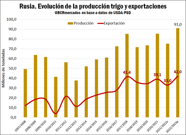 El escenario global del trigo 2022/23 continúa mostrando señales de una demanda firme en un contexto de desbalance global entre oferta y demanda. La campaña 2022/2023 sería la tercera temporada en que, a nivel global, los niveles de producción están por debajo de la demanda y, por lo tanto, los stocks siguen ajustados. El que Rusia, el principal exportador del cereal a nivel global esté en el epicentro geopolítico tras su invasión a Ucrania pone un condimento extra a esta situación. Un punto a destacar es que el Departamento de Agricultura de Estados Unidos (USDA) proyecta que Rusia tendrá una cosecha récord de 91 Mt, 20% superior a la campaña precedente, y con posibilidad de colocar en el mercado internacional 42 Mt. Rusia tiene sanciones económicas por su invasión a Ucrania, lo que preanunciaba dificultades para la fluidez de sus colocaciones en el exterior, particularmente desde el punto de vista logístico. Se había llegado a un acuerdo, y se habilitó, un corredor de granos en el Mar Negro que permitiría sacar los granos sin dificultad. Los despachos comenzaron lentos, pero hay especialistas que prevén que habrá renovación del corredor logístico y se agilizarán las exportaciones.