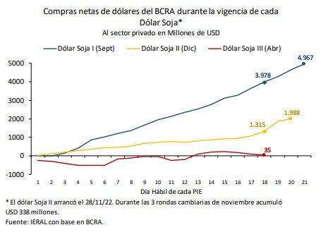 Al respecto, los investigadores del IERAL detallan que “en términos de la base monetaria del arranque de cada ventana de ‘dólar soja’, en la tercera versión la emisión de pesos se está ubicando en un nivel equivalente al 4,7%, cuando durante la versión de ‘dólar soja I’, la emisión fue equivalente al 27,3% de la Base Monetaria del momento de arranque”.