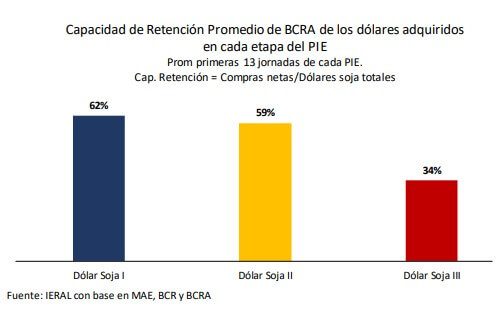 Si bien las liquidaciones actualmente son menores que en las ediciones previas -U$S1.613 M, contra U$S1.824 M y U$S 5.008 M-, lo cierto es que el BCRA apenas ha logrado hacerse con el 34% de los dólares aportados por el agro, cuando en las versiones previas compró el 60%.