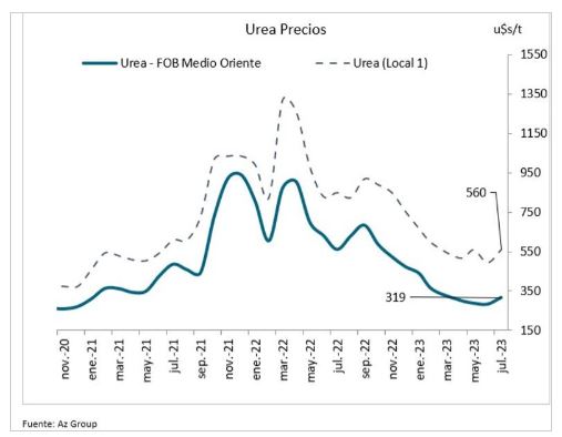 A fines de marzo de 2023, se necesitaban 3,5 t de trigo, con entrega diciembre de 2023, para comprar una t de fosfato monoamónico. A fines de junio, la cantidad necesaria del cereal aumentó a 3,8 t, para ubicarse un 13% por sobre el promedio de los últimos 3 años. Finalmente, al 12 de julio, se requerían 4,1 t de trigo para adquirir 1 t de fertilizante, lo que representa un 19% más que de la media histórica.
