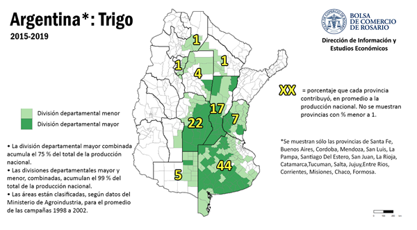 En el promedio de las últimas cuatro campañas, la principal región productiva resulta ser la provincia de Buenos Aires representando el 44% del total nacional, según datos del Ministerio de Agricultura, Ganadería y Pesca (MAGyP), y tal como puede observarse en el mapa adjunto. En segundo lugar se ubica Córdoba con el 22% de la producción nacional, seguida por Santa Fe que origina el 17% de la cosecha triguera. La producción conjunta de estas tres provincias representa más del 80% del trigo argentino. Por otra parte, la provincia de Entre Ríos aporta el 7% de la cosecha nacional, y La Pampa el 5%. Las provincias de Santiago del Estero, Chaco, Tucumán y Salta, situadas al norte de la principal región productora cosechan el 7% de la producción total.
