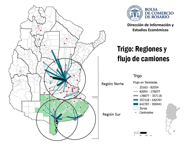 En un intento por identificar las diferentes regiones de comercialización del trigo en Argentina, podría asociarse cada territorio a un puerto de exportación, según su cercanía. La asociación se realiza trazando círculos con radios en los puertos de Rosario y del sur de Buenos Aires (Quequén y Bahía Blanca) y utilizando los flujos de las cartas de porte de camiones publicados por el Ministerio de Transporte de la Nación para el año 2016. Esta evaluación ayuda a visualizar hacia donde se dirige –teóricamente- la producción de trigo con destino de exportación, en primera instancia. Si suponemos que no existe una fuerte influencia de los molinos harineros en los extremos de los círculos trazados podemos concluir que las zonas resultantes ilustran correctamente las regiones de comercialización del trigo en el mercado local.
