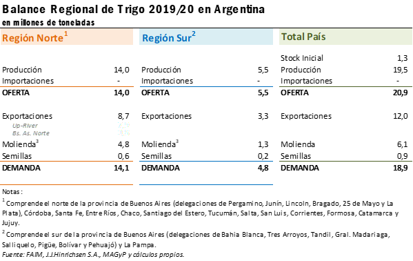Partiendo de una producción de 19,5 Mt para la campaña 2019/20, se estima que la Región Norte cosechó 14 millones de toneladas (Mt) de trigo (72 % del total). En la Región Sur, la producción alcanzó 5,5 Mt (28 % del total).