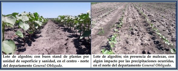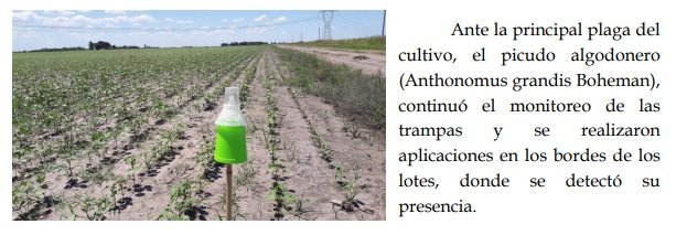 El algodón fue otro de los cultivos que logró un importante grado de avance en el proceso de siembra. En el sector este algodonero, departamentos General Obligado, norte de San Javier, Vera y noreste de San Cristóbal, finalizó la implantación y en el sector oeste, departamento Nueve de Julio, se alcanzó un avance del 60 % de la intención de siembra, que se estimó alcanzaría las 40.000 ha. Se constató la considerable aparición de malezas, dado que no se efectuaron los controles necesarios en tiempo y forma, porque las condiciones de los pisos no permitieron el ingreso a los campos. Debido a la solicitud de los productores, el Servicio Nacional de Sanidad y Calidad Agroalimentaria (SENASA) estableció los siguientes períodos de siembra para ambas zonas: • “1° de octubre al 30 de noviembre: Domo Oriental (Departamento General Obligado, Departamento Garay, Departamento San Javier, Departamento Vera al este de la ruta Provincial Nº 3 y al sur de la ruta Nacional Nº 98)”. • “1º de noviembre al 15 de diciembre: Domo Occidental (Departamento 9 de Julio, Departamento San Cristóbal, Departamento Las Colonias, Departamento Vera al oeste de la ruta Provincial Nº 3 y al norte de la ruta Nacional Nº 98)”. Por tal cambio se amplió la ventana de implantación para ambas zonas. Recordando que los productores deberían respetar el vacío sanitario de 90 días sin cultivo, por lo que sería fundamental la destrucción de los rastrojos, dentro del margen de las fechas límites establecidas