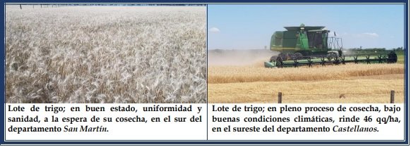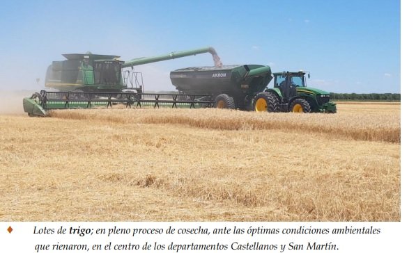 A posteriori días soleados, estabilidad y escasa a nula nubosidad, buen tiempo, temperaturas diarias algo superiores a los 32 ºC. Dichas realidades, recargaron los perfiles de los suelos y conformaron óptimos ambientes para una segunda semana intensa de actividades de cosecha de trigo, siembra de soja temprana, arroz, sorgo granífero, algodón, soja tardía y monitoreos de los cultivos ya implantados, los que expresaron todo su potencial genético, observándose estados muy buenos con lotes excelentes.