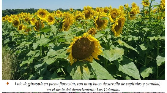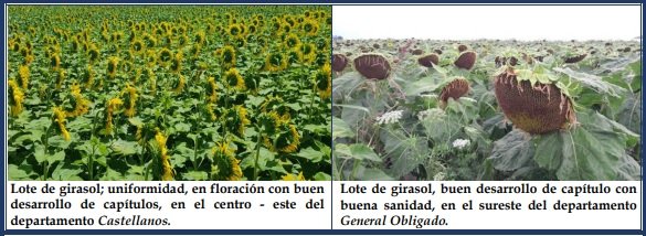 Los girasoles presentaron muy buen estado, desarrollándose en forma normal y con óptimo contenido de humedad en los perfiles de los suelos. Los días soleados continuaron permitiendo el trabajo de los insectos polinizadores 7 en los lotes sembrados en fechas más tempranas y que transitaban el proceso de floración. En cuanto al aspecto sanitario, hasta el momento no se detectaron plagas ni enfermedades, pero se prosiguió con el monitoreo de los predios. Se observaron los siguientes estados fenológicos: V “estados vegetativos”, 9 (9º par de hojas verdaderas), R “estados reproductivos”, R2 (distancia de menos de 2 cm entre la inserción del botón floral y la última hoja), R3 (distancia de más de 2 cm entre la inserción del botón floral y la última hoja), R5 “antesis”, R5 – 1 (inicio de antesis) y los más avanzados, comienzo de R5 – 5 (mitad de floración, 50 %. El % depende del área del capítulo cubierto por flores, cantidad de círculos).