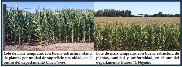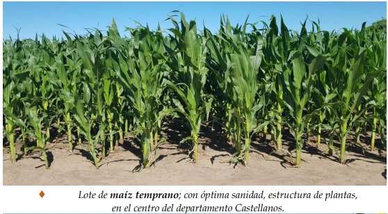 Bajo condiciones ambientales ideales, como consecuencia de las últimas lluvias de la semana, los cultivares de maíz continuaron expresando todo su potencial genético, desarrollándose sin inconvenientes y evidenciando muy buenos estados, con lotes excelentes. Para el comienzo del período crítico de floración y fructificación, no se avizoraron complicaciones, por lo que comenzaron las expectativas de los resultados de los futuros rendimientos, las que irían en aumento con el transcurso de los días. La sanidad de los sembradíos se encontró muy bien, sin presencia de plagas ni enfermedades. Se observaron los siguientes estados fenológicos: V “estados vegetativos”, V4 (4º hoja desarrollada), V5 (5º hoja desarrollada), V6 (6º hoja desarrollada), V7 (7º hoja desarrollada), V8 (8º hoja desarrollada), V9 (9º hoja desarrollada), V10 (10º hoja desarrollada), Vt (panojamiento), R “estados reproductivos”, R1 (emergencia de estigma) y los más avanzados, en R2 (cuaje ampolla).