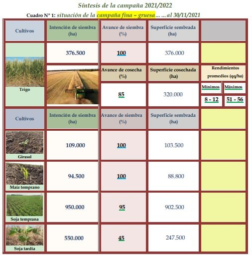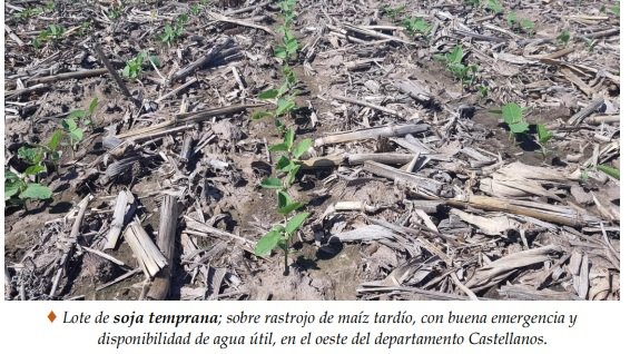 Las óptimas condiciones ambientales que reinaron los últimos quince a veinte días, adelantaron el proceso de implantación de la soja tardía unos siete a diez días, en comparación al inicio de los años anteriores, la que se producía los primeros días del mes de diciembre. Para la campaña de cosecha gruesa 2021-2022, la intención de siembra de soja tardía se estimó en unas 550.000 ha, similar a la del año anterior. Hasta la fecha se logró un grado de avance en el proceso de implantación del 45%, aproximadamente unas 247.500 ha.