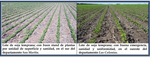 Para la campaña de cosecha gruesa 2021-2022, la intención de siembra de soja temprana se estimó en unas 950.000 ha, con un incremento del 1,5 al 2 %, en referencia a la superficie alcanzada el año anterior, que fue de 935.000 ha. Hasta la fecha se logró un grado de avance en el proceso de implantación del 95 %, unas 902.500 ha. Los cultivares presentaron muy buen estado, con un normal crecimiento, lográndose una correcta germinación y emergencia, dadas las buenas condiciones ambientales ocurridas desde el inicio de la misma. Se observaron los siguientes estados fenológicos: V “estados vegetativos”, VE (emergencia), Vc (estado de cotiledón, hojas unifoliadas pegadas), V1 (1º nudo) y V2 (2º nudo).