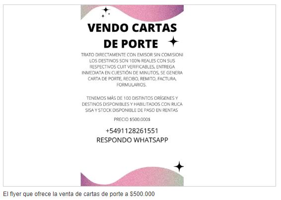 Ilegal y cubierto. Por ahora no se sabe si hubo operaciones realizadas a partir de este servicio ilegal. “Si ha habido alguien que lo hizo no va a decirlo. Interpretamos que, si se animan a sacarlo así por WhatsApp, se trata de un negocio para los que lo hacen. Yo con esto vendo en negro y tengo una cobertura legal absoluta. Nadie me puede parar (en la ruta). Si me paran tengo carta de porte oficial y cumplís con todas las reglamentaciones. Esto se vende de manera ilegal, pero con una cobertura total y sin riesgos”, advirtió Rivara.