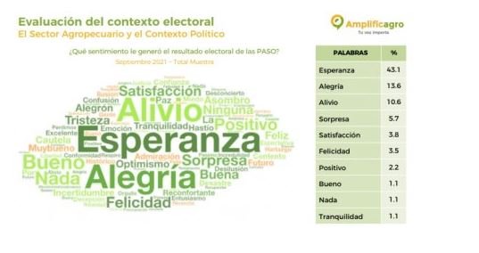 La encuesta se desarrolló entre los responsables de 513 establecimientos que fueron consultados sobre el resultado de las elecciones. El 43% de los participantes manifestó sentir esperanza, mientras el 13,6% afirmó sentir alegría y un 10,6% expresó alivio.