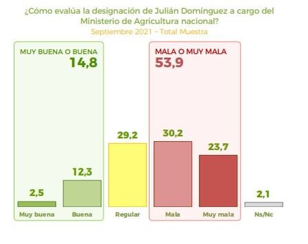 La designación de Julián Domínguez como nuevo ministro de Agricultura, Ganadería y Pesca no representó un motivo de cambio de expectativas. El 53,9% de los encuestados opinó que el nombramiento era malo o muy malo y un 29% lo calificó como regular. Solo el 14,8% de los consultados expresó que el nombramiento era bueno o muy bueno.
