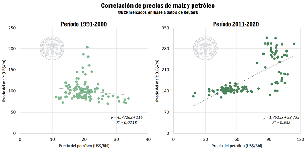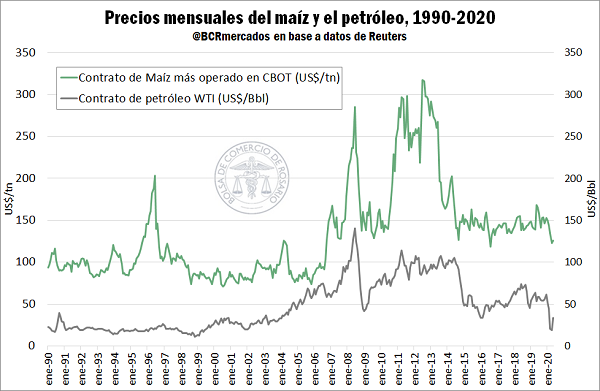 Previamente a la introducción de mandatos de etanol en Estados Unidos (2010), durante los noventa y la primera década de los 2000 los valores de petróleo y maíz no guardaban relación aparente uno con otro, tal como se advierte en el gráfico. La semejanza que puede observarse en el pico y posterior depresión que ambas cotizaciones dibujaron en 2008 y 2009 responde a las tendencias bursátiles generalizadas en el marco del boom y crisis económica de esos años, y no a una correlación directa entre ambos precios. Sin embargo, a partir de los mandatos de corte de etanol en gasoil en los Estados Unidos en 2010 (E10) y 2011 (E15), las tendencias de precio en estos dos mercados comienzan a asemejarse. Hacia el final de la serie de tiempo se distingue la abrupta caída en los precios que provocó el cisne negro del Coronavirus, que paralizó la demanda de transporte bruscamente en el comienzo de 2020. El mercado del petróleo, en constante puja de precios dada la sobreoferta que originó el crecimiento del shale oil, experimentó en los meses iniciales del año un desplome sin precedentes. El maíz replicó esta caída en Chicago por la dirección directa que existe entre menor demanda de combustible y menor demanda de etanol.