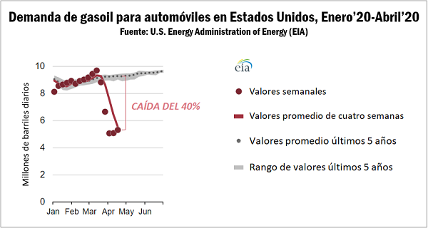 EIA (U.S. Energy Information Administration) aproxima el consumo semanal de gasoil para automóviles en Estados Unidos, el que representa el 45% de la demanda total y el rubro que compete a la industria del etanol. El consumo diario de gasoil para automóviles pasó de un promedio de 8,9 millones de barriles diarios entre el 1 de enero al 13 de marzo, cuando aún no se habían implementado medidas de aislamiento, a 5,3 millones de barriles diarios el 17 de abril con parte de la actividad económica discontinuada. Es decir, el consumo de los automovilistas estadounidenses se contrajo un 40% en el término de un mes.
